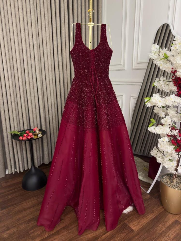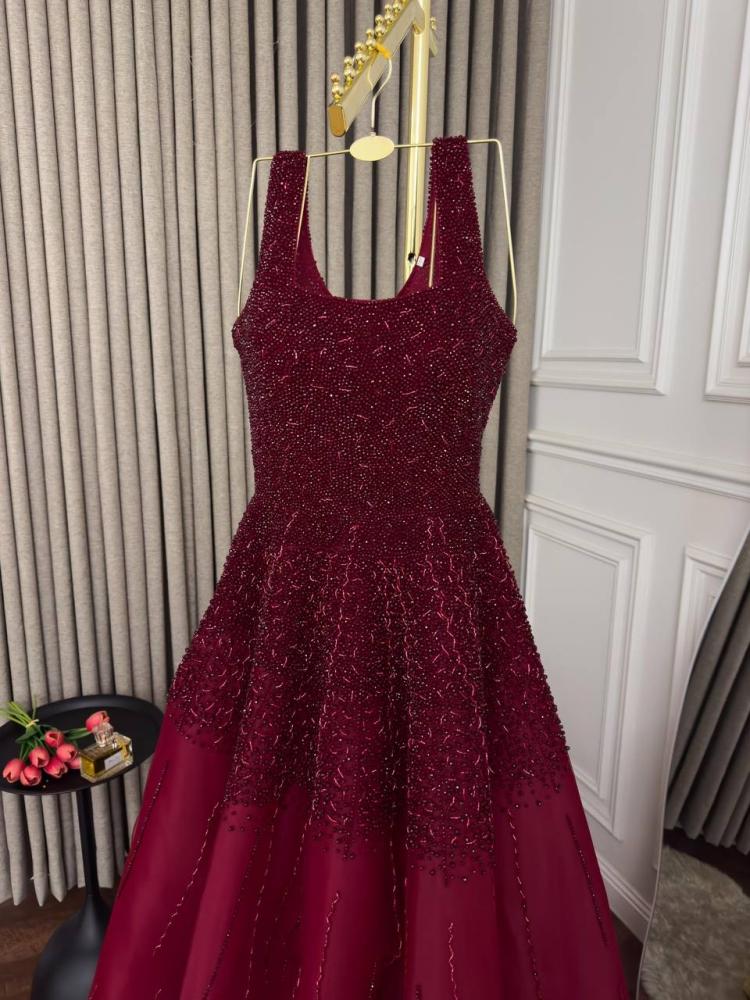 اسم المنتج: فستان سهرة عنابي مطرز بخرز