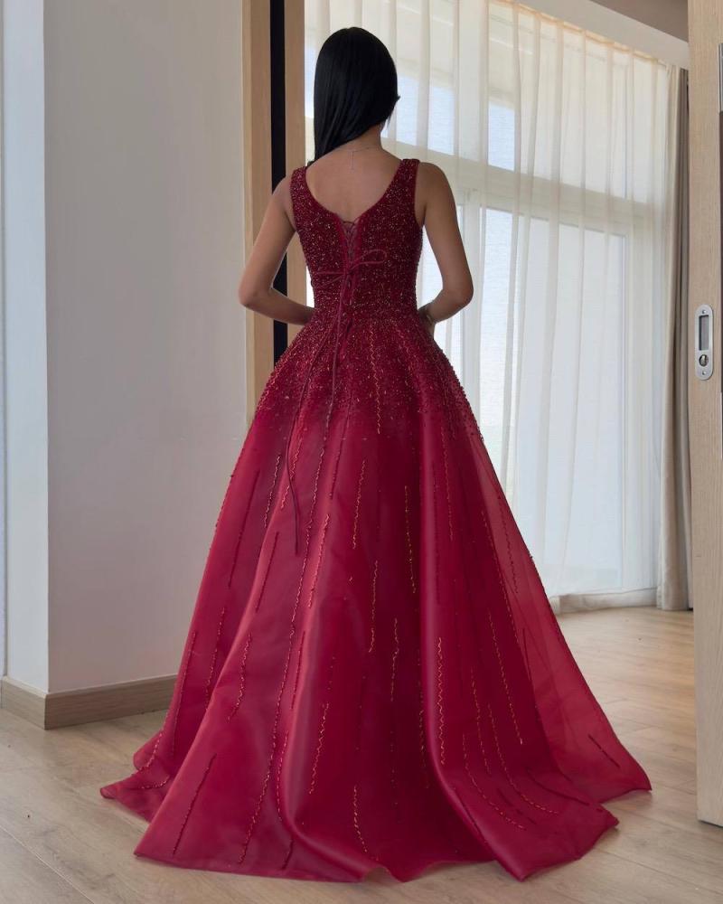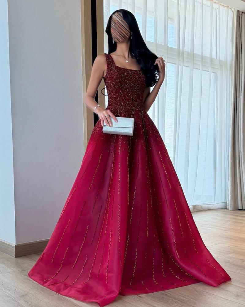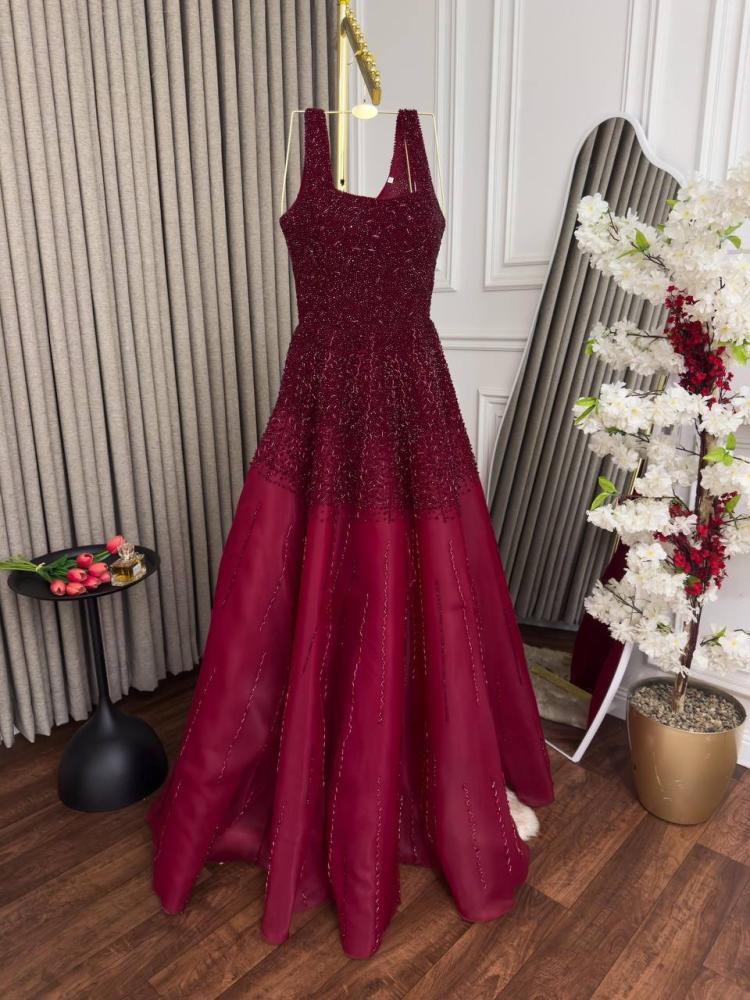 فستان سهرة احمر مطرز بخرز هو الاختيار المثالي لكل سيدة تبحث عن الأناقة والجاذبية في المناسبات الخاصة حيث يتميز هذا الفستان بتصميمه الطويل ولونه الأحمر الغامق اللي يضيف لمسة من الفخامة؛ الخرز المتناثر على الصدر يزيد من جاذبية الفستان ويعطيه بريق خاص تحت الإضاءة.