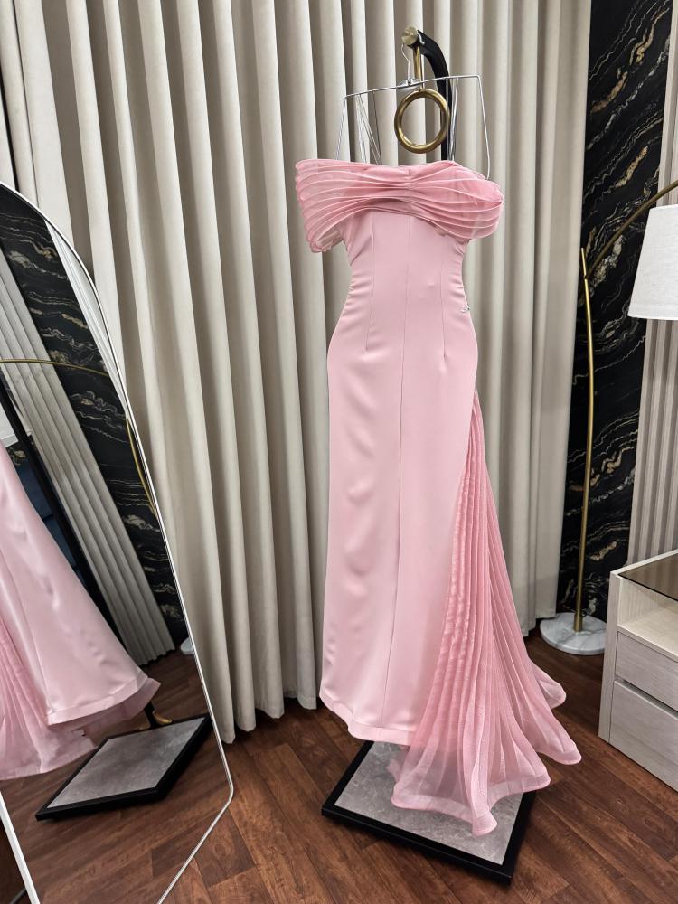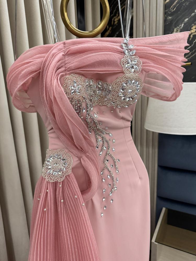 فستان سهره بألوان البنكي تطريز شك يدوي