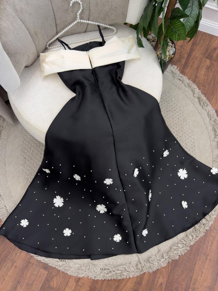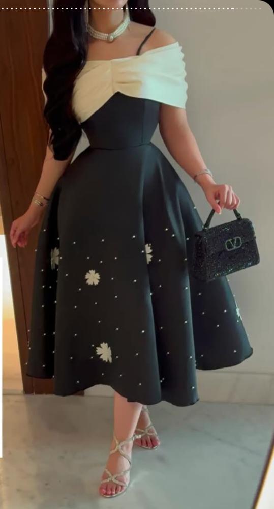 فستان اسود بأكتاف مكشوفه بلون كريمي