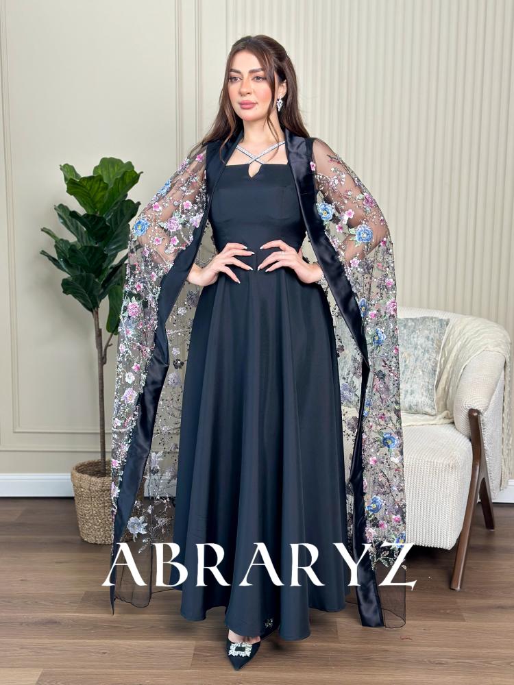 فستان طويل بقصة مستقيمة وشال طويل مطرز بالزهور