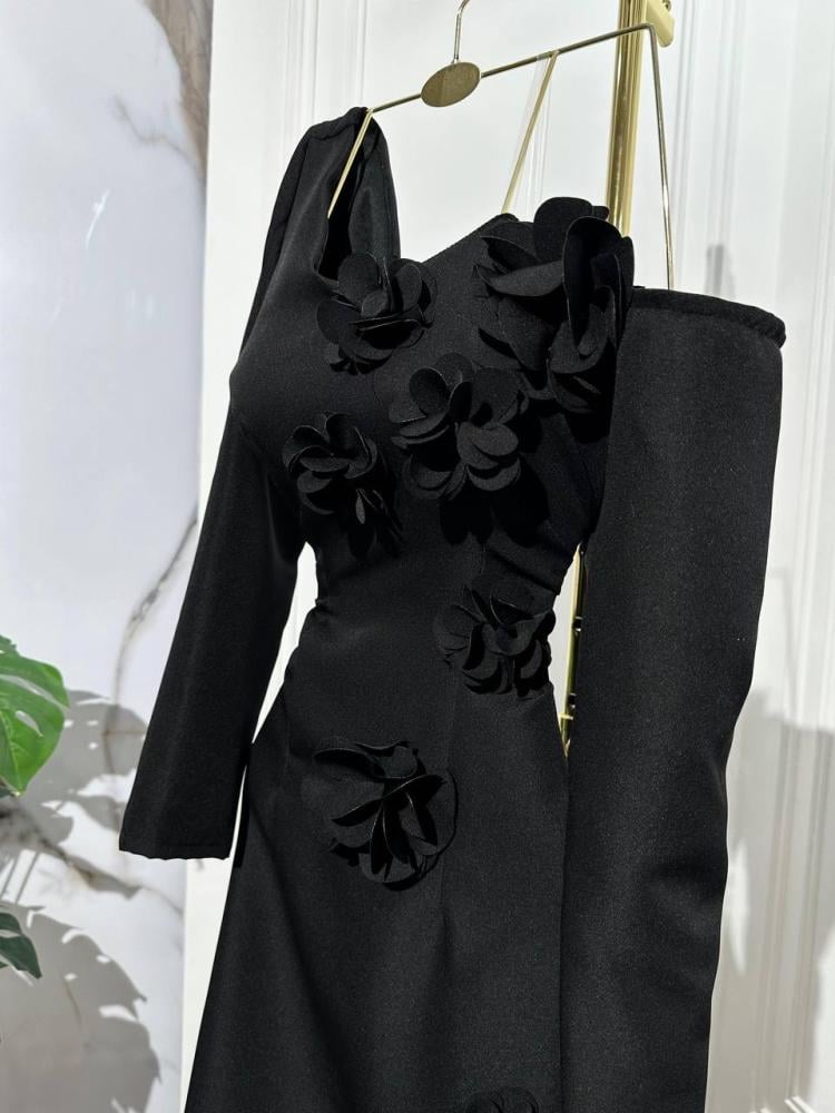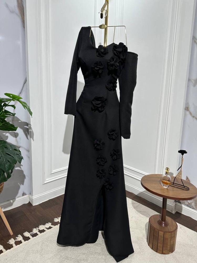 - فستان سهرة اسود طويل بتفاصيل الورود البارزة التي تزين الفستان بأناقة وتميز.