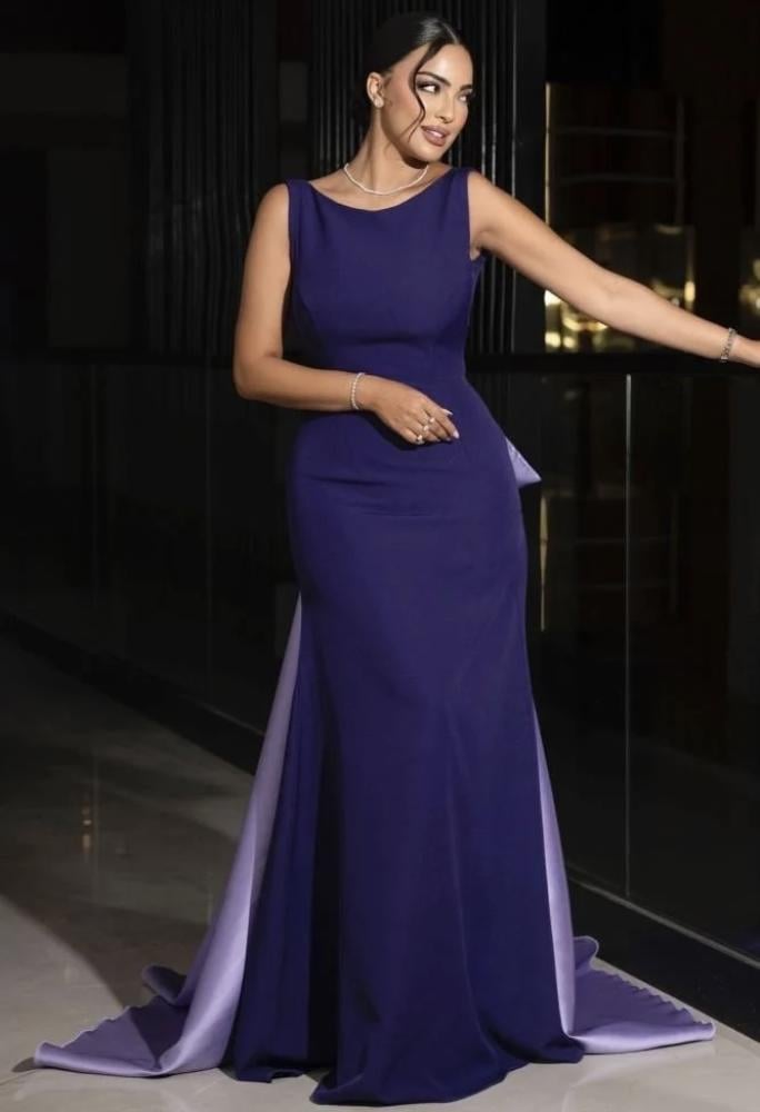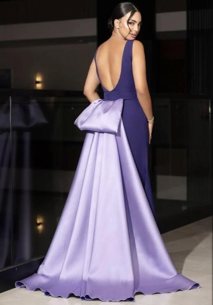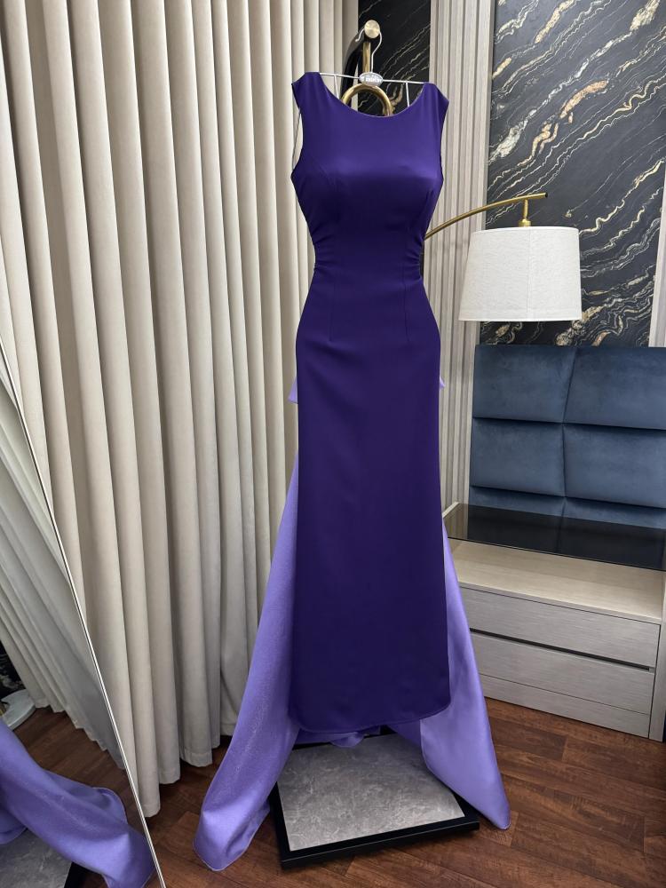 فستان أنيق بلون بنفسجي ملكي، ضيق بقصة ناعمة تبرز الجسم. يتميز بظهر مفتوح على شكل حرف V مع ذيل طويل بلون أرجواني فاتح وفيونكة كبيرة تضيف لمسة فخامة. تصميم يجمع البساطة والجاذبية.