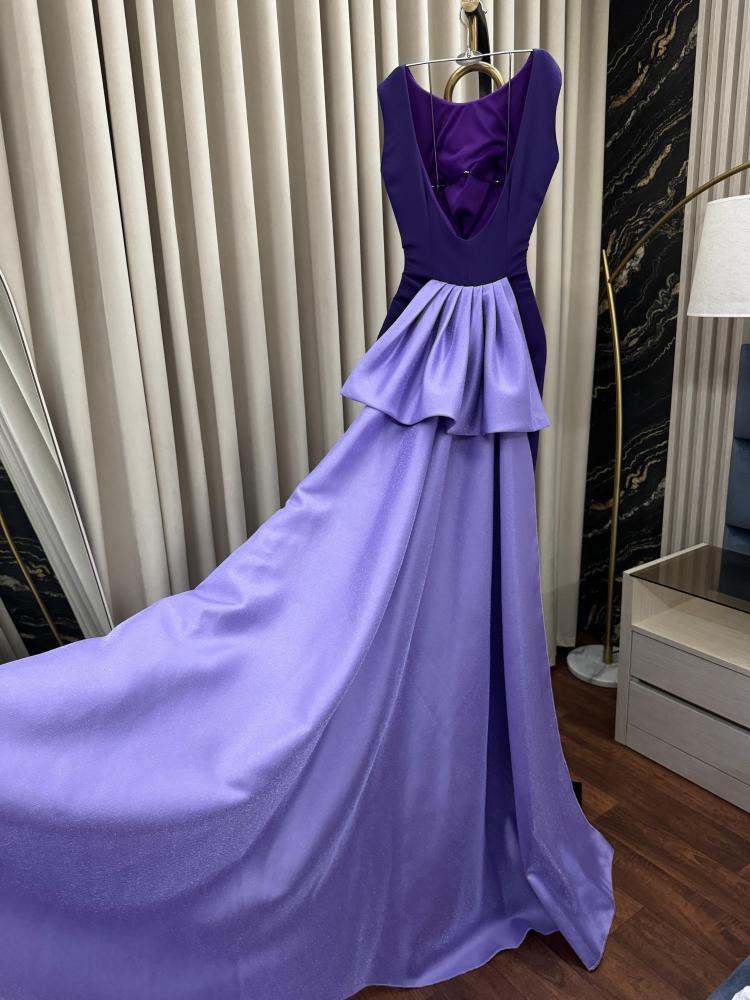 فستان سهرة طويل بذيل لون بنفسجي