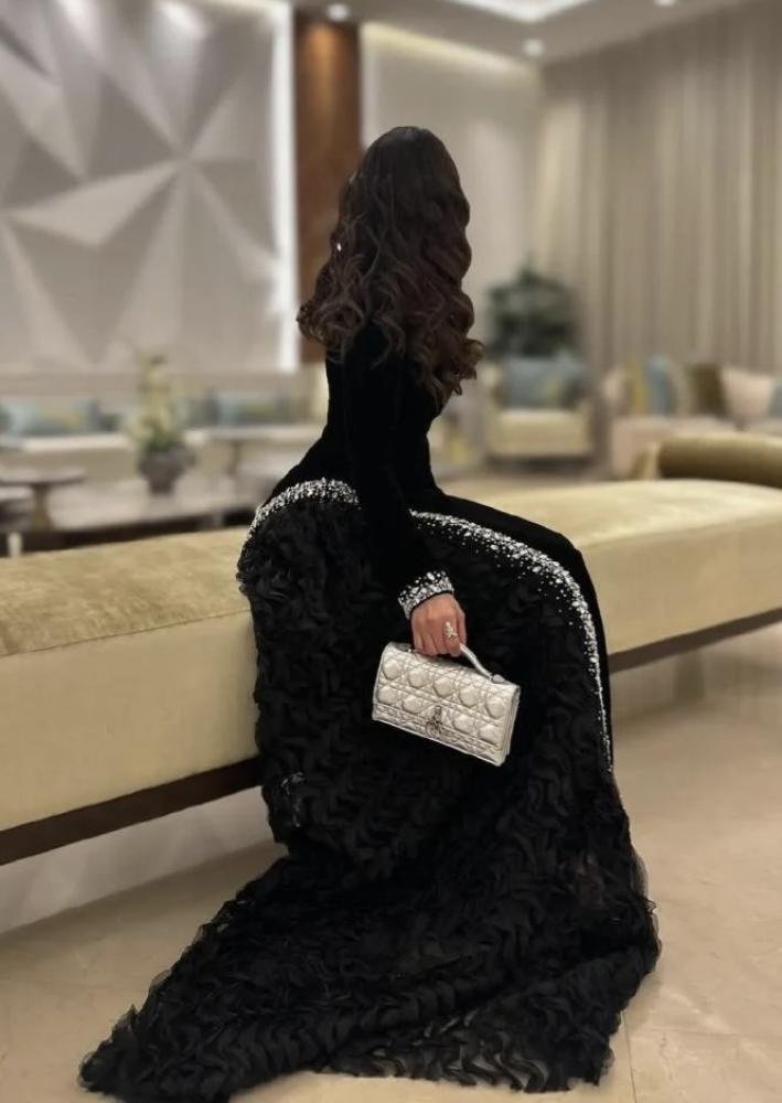 الفستان في الصورة هو فستان سهرة أنيق باللون الأسود. يتميز الفستان بأكمام طويلة وياقة دائرية مزينة بالخرز اللامع. الجزء السفلي من الفستان يحتوي على تصميم مميز حيث يمتد شريط من الخرز اللامع من الخصر إلى الأسفل، وينتهي بقطعة من القماش المزخرف بشكل متموج. الفستان مصنوع من قماش مخملي ويبدو أنه مصمم ليكون ملائمًا للمناسبات الرسمية.