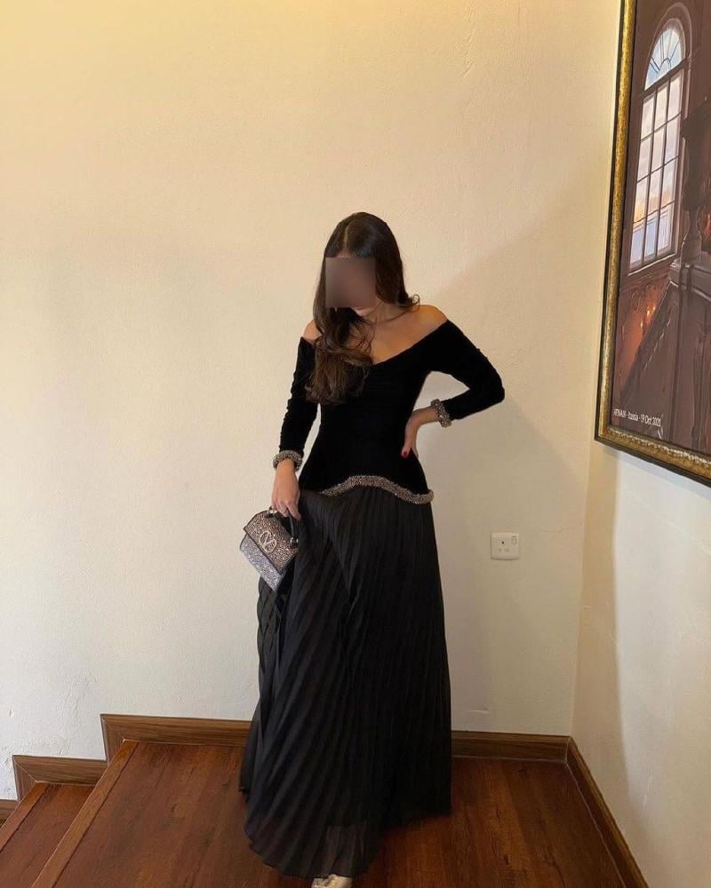 فستان أنيق يجسد الفخامة والبساطة في آنٍ واحد، بتصميم ملفت باللون الأسود الكلاسيكي. يتميز الجزء العلوي بقماش الجوخ الفاخر، الذي يضفي لمسة من الدفء والرقي، مع أكمام طويلة تعزز من جمال التصميم. يتناغم هذا الجزء بسلاسة مع التنورة الكلوش المصنوعة من قماش الميكادو اللامع، الذي يضفي انسيابية وأناقة على الإطلالة. الفستان مثالي للمناسبات الرسمية والسهرات، حيث يجمع بين البساطة والتفاصيل الراقية التي تعكس الذوق الرفيع.
