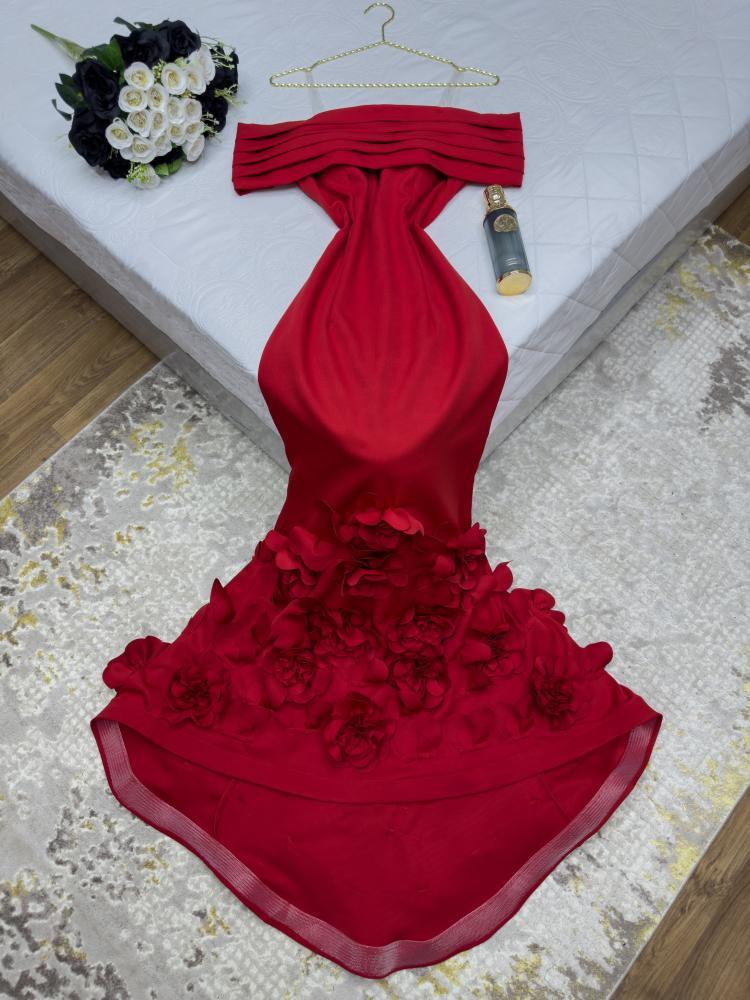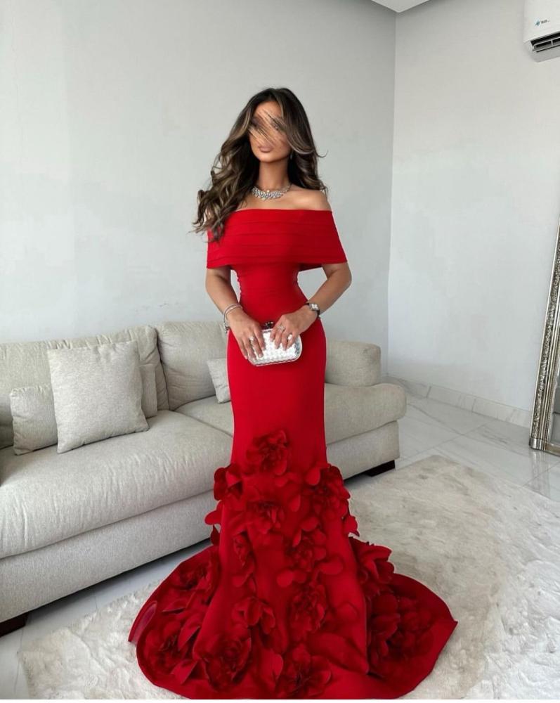 الفستان أنيق بتصميم ضيق يظهر تفاصيل الجسم، ويتميز بقصة الكتف المكشوف وطبقات أفقية عند الصدر تضيف لمسة أنيقة. الجزء السفلي من الفستان يتزين بزهور بارزة كبيرة تضفي لمسة من الرقي والحيوية. يمتد الذيل قليلاً على الأرض مما يعطي الفستان مظهراً فاخراً وجذاباً يتوفر بأربع الون مختلفه