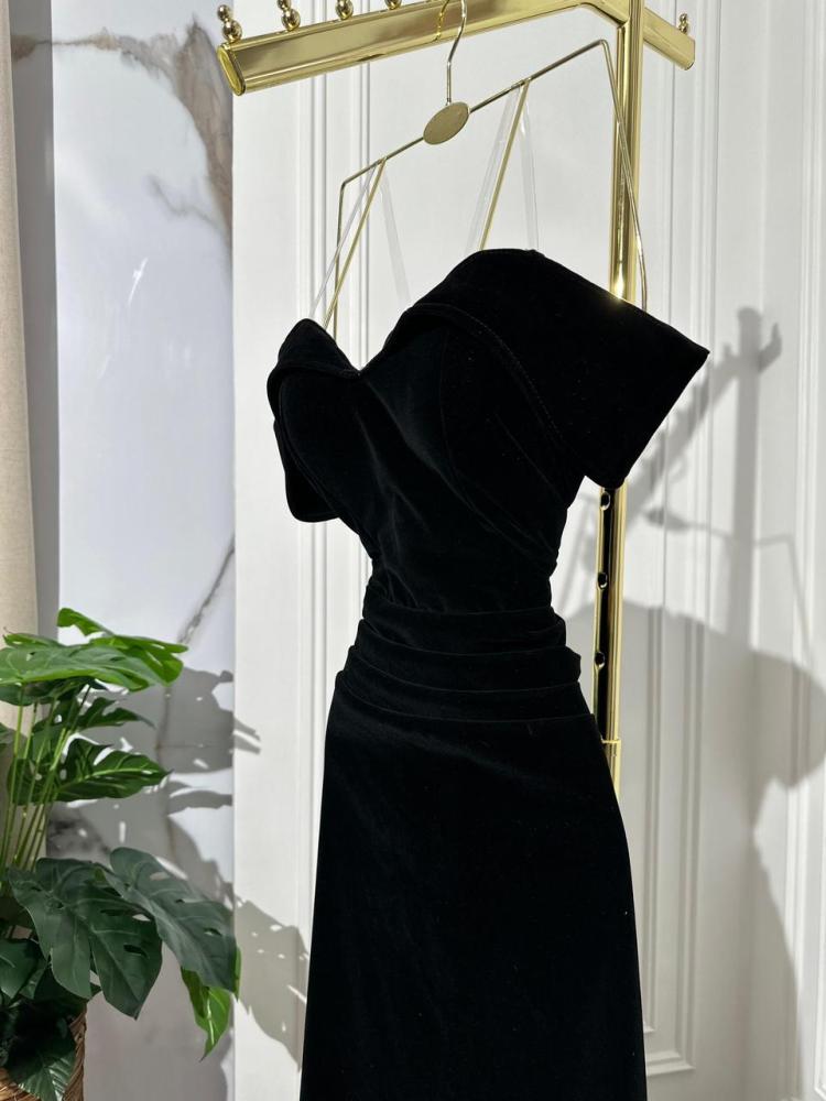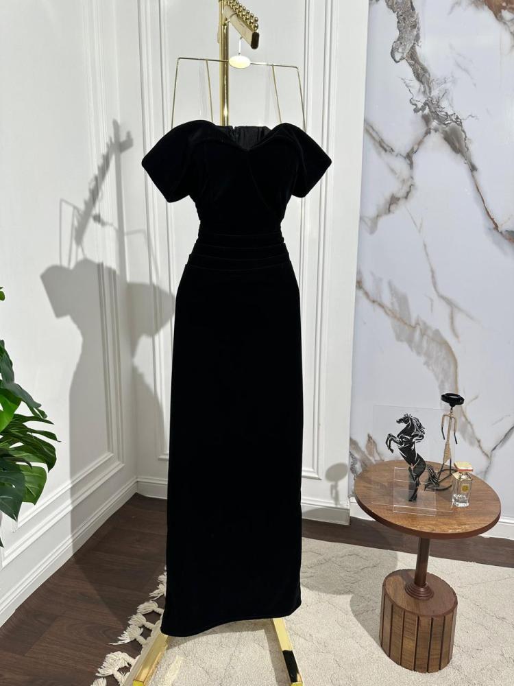 - فستان مخمل اسود طويل يعكس الفخامة والأناقة بفضل خامته المخملية.
